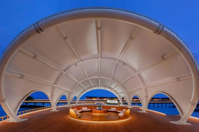 - На территории — японский ресторан над водой, Sunset Bar с видом на океан и Hawker с атмосферой уличной азиатской кухни.